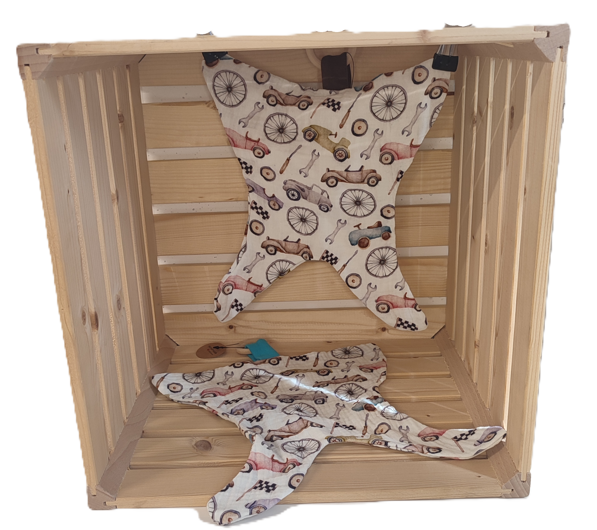 Der Nuschistern hat einen Holzring angenäht, so dass man den Nuggi befestigen kann.
